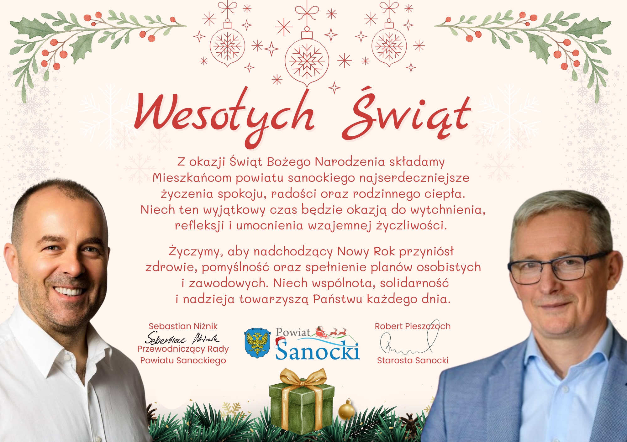 Z okazji Świąt Bożego Narodzenia życzenia Mieszkańcom Powiatu Sanockiego składają Starosta Sanocki Robert Pieszczoch oraz Przewodniczący Rady Powiatu Sanockiego Sebastian Niżnik: