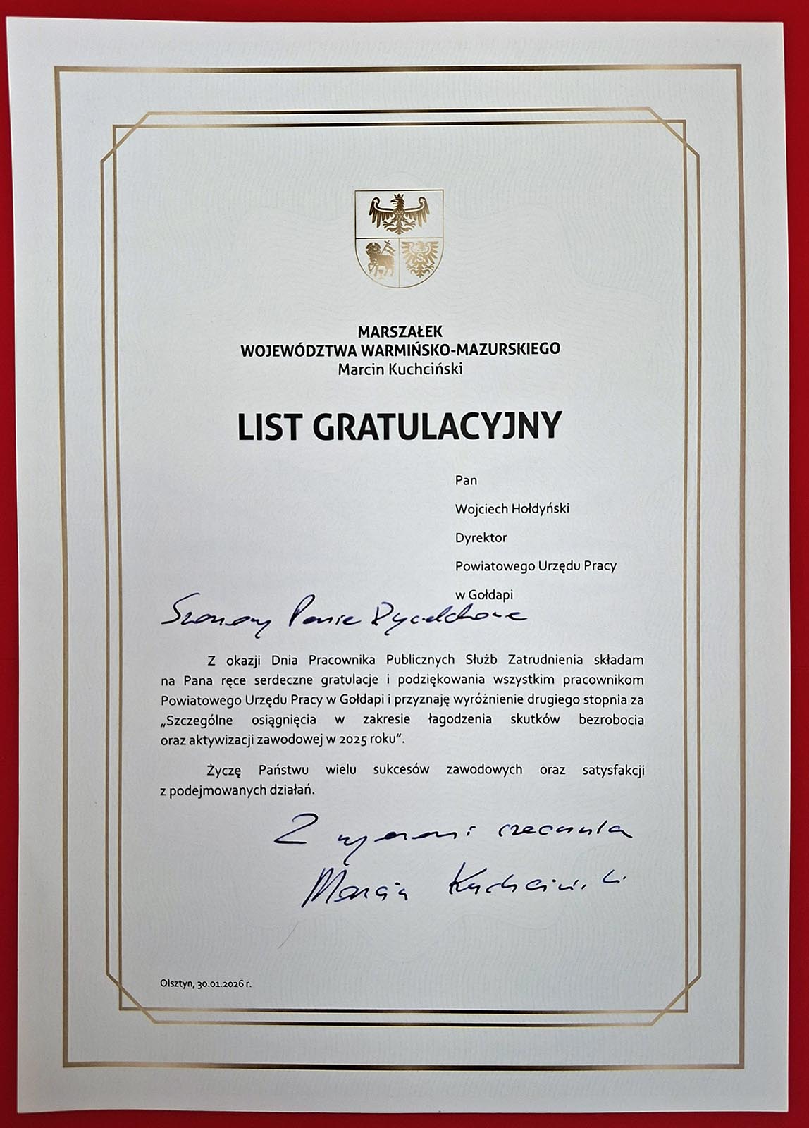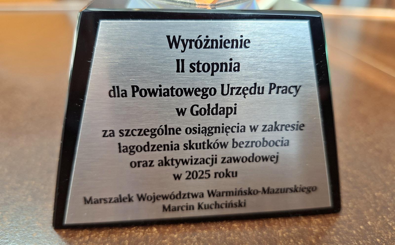 Ważnym dla Powiatowego Urzędu Pracy w Gołdapi wydarzeniem było wręczenie przez marszałka województwa warmińsko-mazurskiego pana Marcina Kuchcińskiego oraz członka Zarządu Województwa Warmińsko-Mazurskiego pana Roberta Turleja Wyróżnienia II stopnia za szczególne osiągnięcia w zakresie łagodzenia skutków bezrobocia oraz aktywizacji zawodowej w 2025 roku.