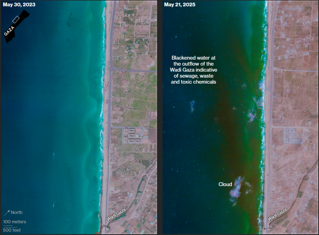 Zdjęcia satelitarne z czerwca 2025 roku pokazują prawie 350 nieformalnych wysypisk rozrzuconych po całej Strefie Gazy, zajmujących ponad 1 km². Większość znajduje się w pobliżu mieszkańców i punktów czerpania wody. Zawalone budynki wygenerowały już ponad 61 mln ton gruzu, uwalniając do środowiska toksyczne substancje.