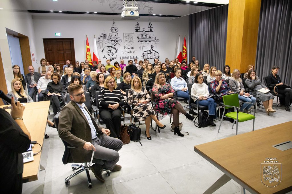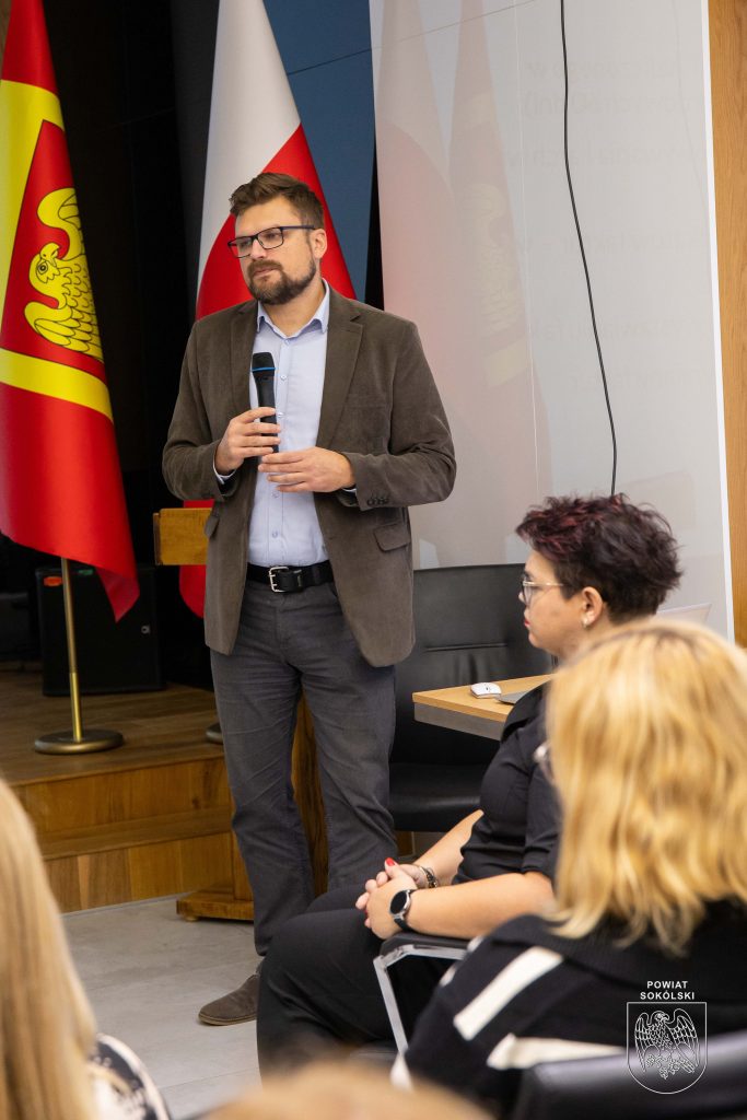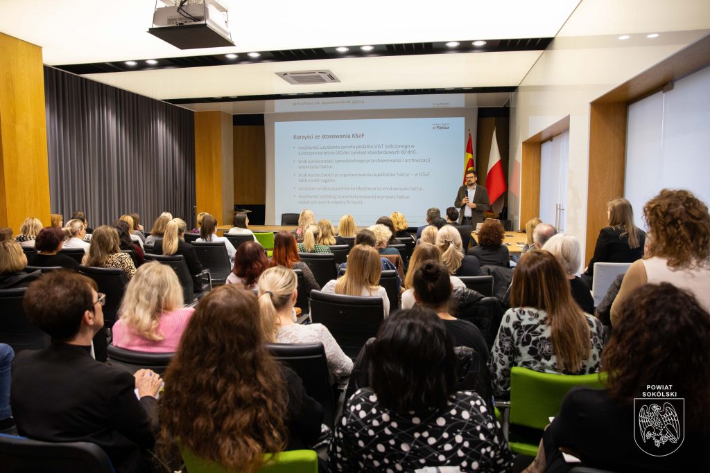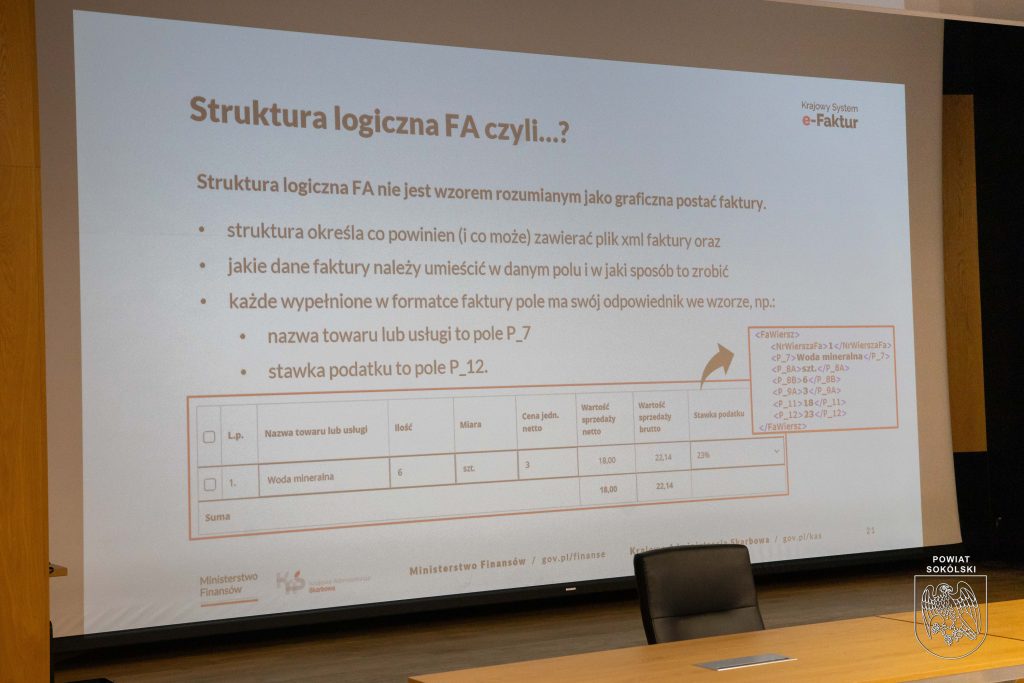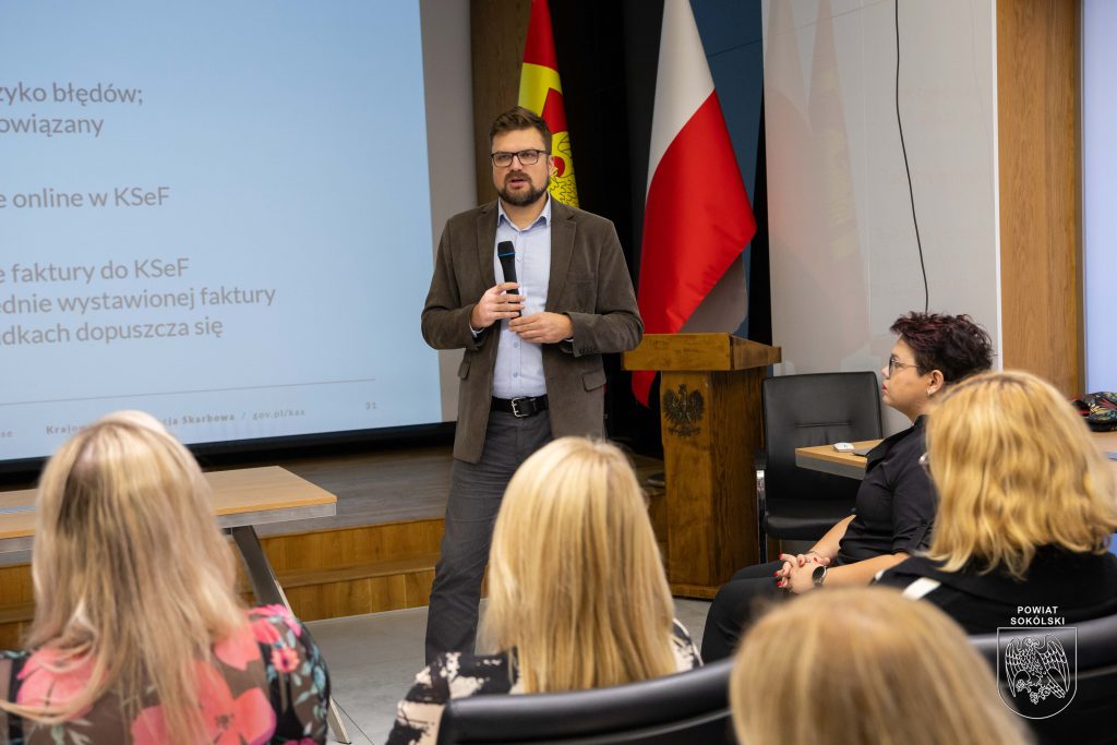 Na prośbę Naczelnika Urzędu Skarbowego w Sokółce oraz z myślą o jednostkach samorządu terytorialnego, w Starostwie Powiatowym w Sokółce zorganizowano dziś spotkanie szkoleniowe poświęcone Krajowemu Systemowi e-Faktur (KSeF). Szkolenie poprowadzili regionalni trenerzy KSeF z ramienia Izby Administracji Skarbowej w Białymstoku: Anna Jakoniuk, koordynator KSeF, oraz Jacek Juszkiewicz, zastępca naczelnika Pierwszego Urzędu Skarbowego w Białymstoku.