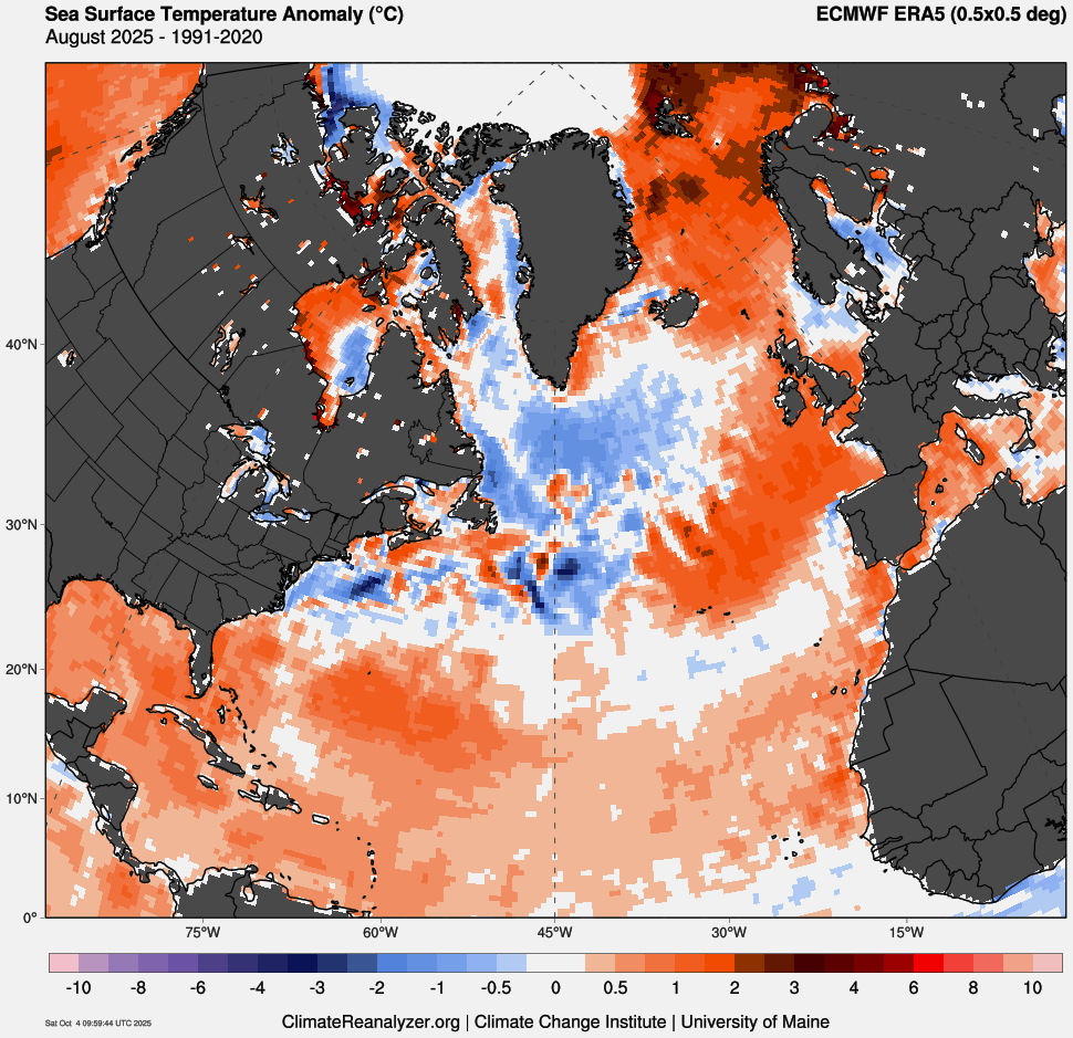 Załączona mapa pokazuje odchylenia temperatur powierzchni północnego Atlantyku w sierpniu – od Afryki po Zatokę Meksykańską wody były cieplejsze od średniej o 0,5–1,5 st. C.