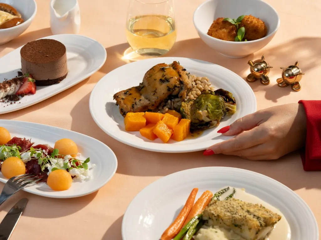 Each meal is plated beautifully, with restaurant-style presentation rather than the usual tray. Middle Eastern classics such as lamb machboos sit alongside more international dishes like seared salmon or tender beef fillet.