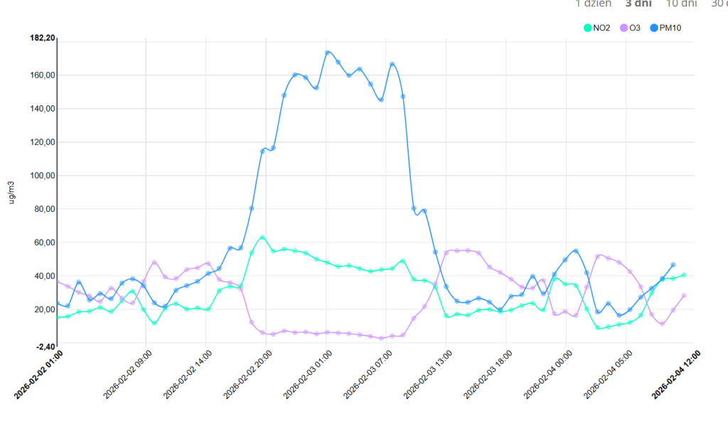 Odczyty poziomu jakości powietrza w Zakopanem od 2 lutego do 4 lutego 2026 roku. Źródło: GIOŚ.Najgorzej jest w godzinach popołudniowych i nocnych. Jako jaskrawy przykład wybraliśmy 2 lutego. Tego dnia od godziny 16:00 widzimy, jak odczyty szybują w górę, osiągając duszące maksimum około godziny 2 w nocy – 173,5 µg/mł pyłu PM10. Kilka godzin później – o ósmej rano – jest równie fatalnie: monitoring pokazuje 166 µg/mł. „Dobre” powietrze według polskiej skali jest dopiero około południa (54 µg/mł).
