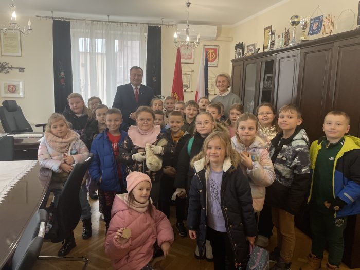 Uczniowie zostali oprowadzeni po urzędzie, następnie mieli okazje spotkać się z Panem Burmistrzem w jego gabinecie i zadawać trudne pytania.