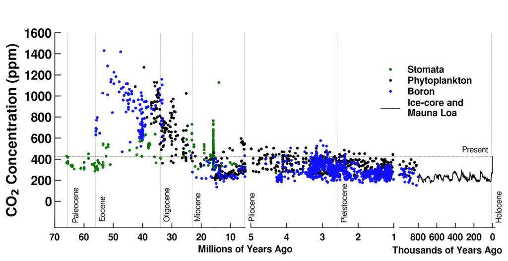 Stężenie dwutlenku węgla w atmosferze Ziemi w ciągu ostatnich 70 mln lat. Źródło: Scripps Institution of OceanographyNauka kontra ideologia Trumpa