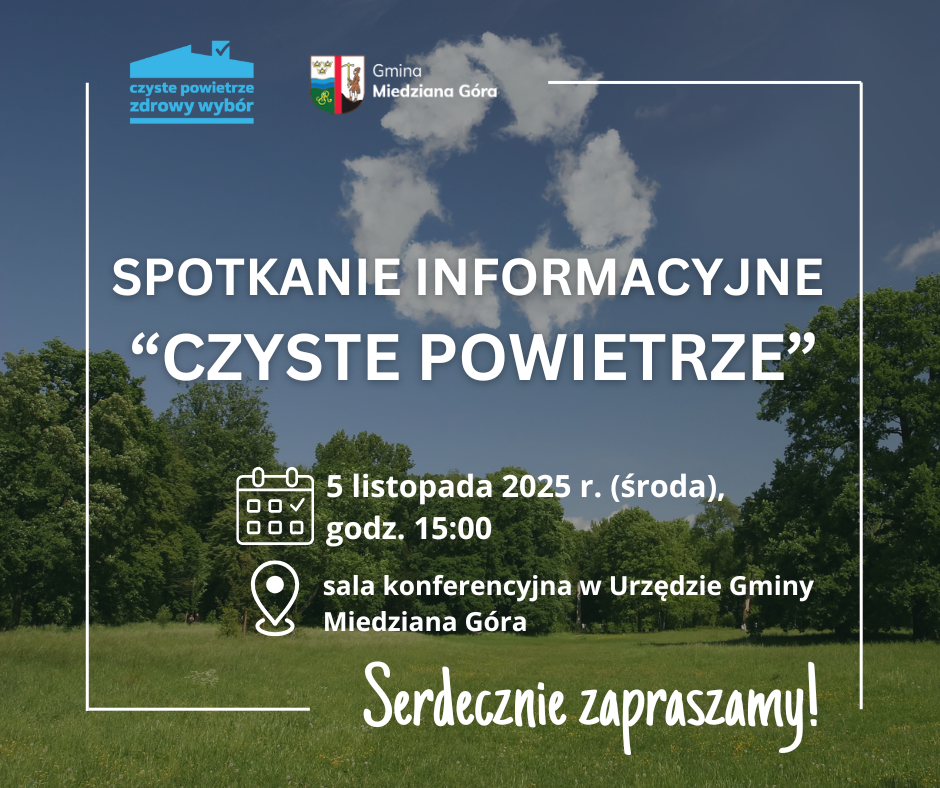 Wójt Gminy Miedziana Góra zaprasza wszystkich zainteresowanych mieszkańców Gminy na spotkanie dotyczące dofinansowania w ramach programu ˝Czyste Powietrze˝. Podczas spotkania zostanie przedstawiona nowa odsłona programu ˝Czyste Powietrze˝ obowiązująca od 31 marca 2025 r. (zasady, warunki i procedura uzyskania dofinansowania),