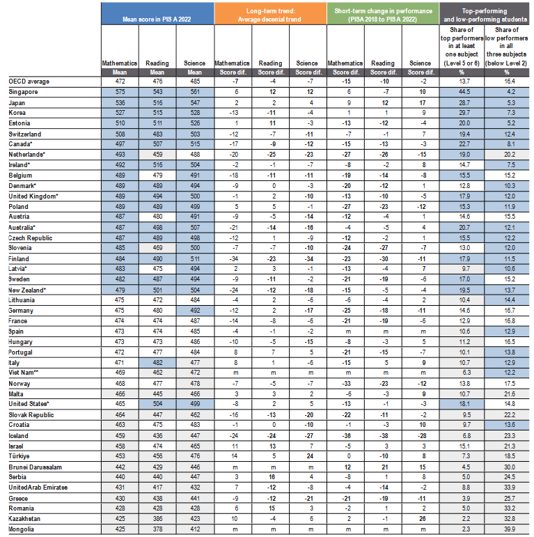 W 2022 r. w tej pierwszej kategorii Finowie wypadli nieco gorzej niż Polacy, w pozostałych dwóch – lepiej. Jednak w ciągu ostatnich dwóch dekad wyniki Finów drastycznie spadły, podczas gdy Polska odnotowała nieznaczne wzrosty w dwóch kategoriach i minimalny spadek w dziedzinie nauk przyrodniczych.