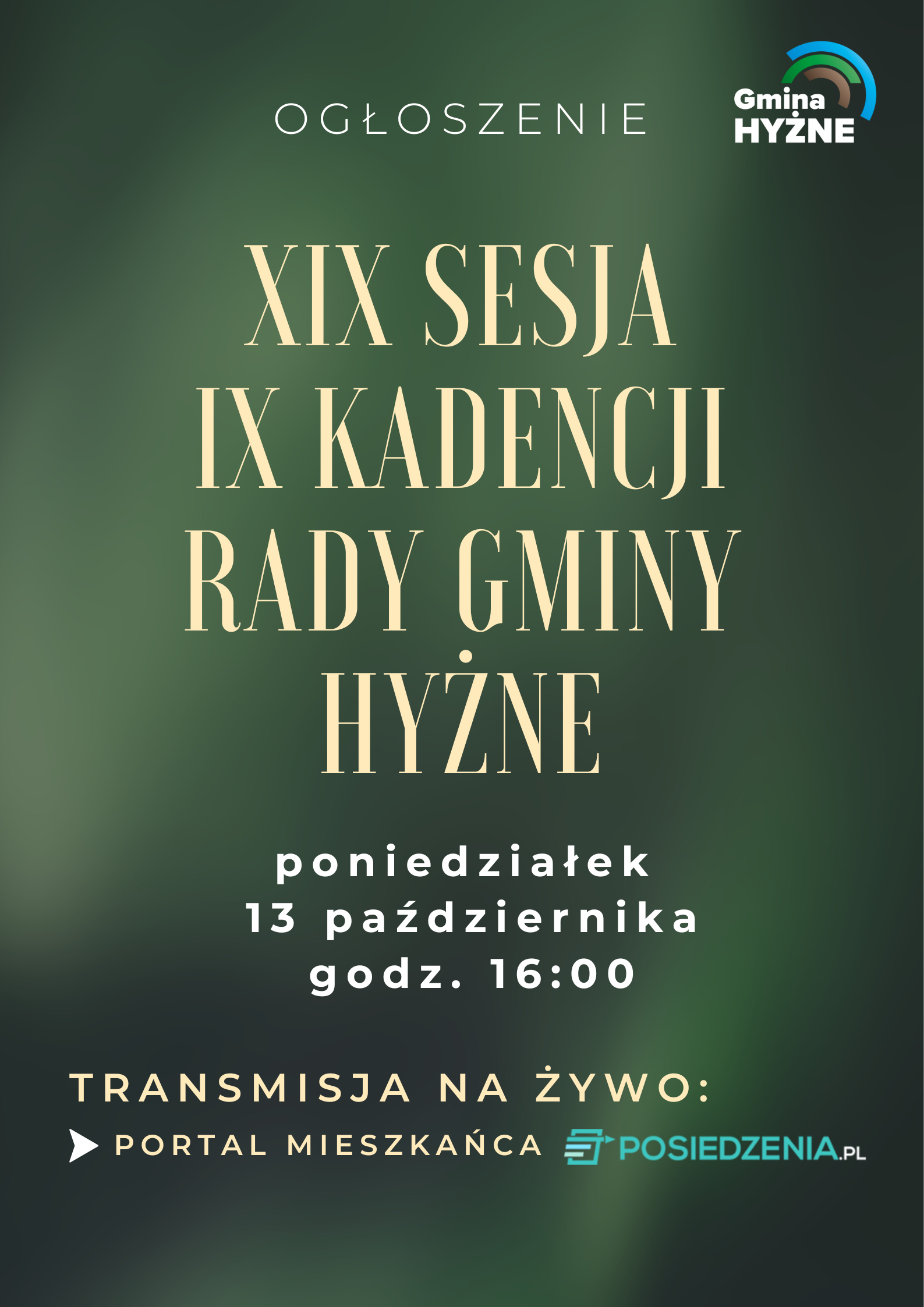 Przewodniczący Rady Gminy Hyżne informuje, że XIX sesja Rady Gminy Hyżne odbędzie się 13 października 2025 r. o godz. 16:00 w sali konferencyjnej Urzędu Gminy Hyżne.