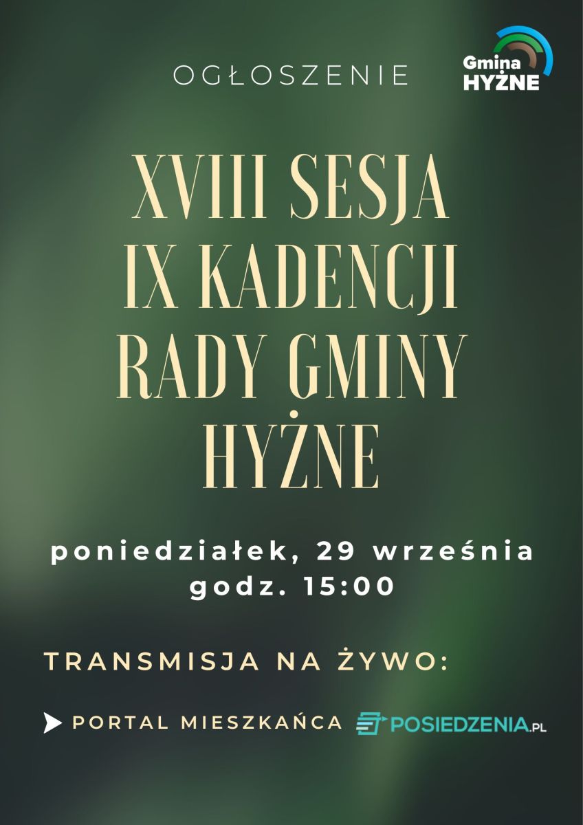 Przewodniczący Rady Gminy Hyżne informuje, że XVIII sesja Rady Gminy Hyżne odbędzie się 29 września 2025 r. o godz. 15:00 w sali konferencyjnej Urzędu Gminy Hyżne.