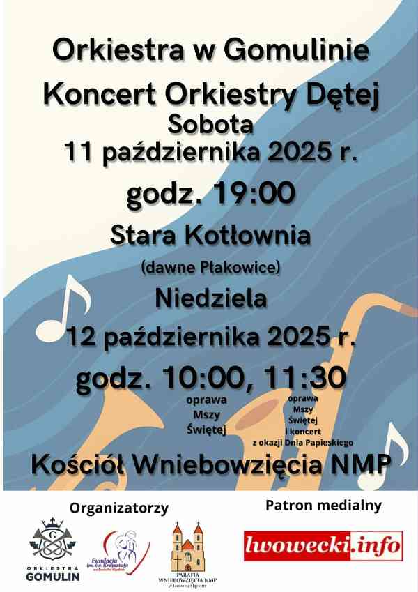 Natomiast w niedzielę 12 października, orkiestra uświetni dwie msze święte w kościele pw. Wniebowzięcia NMP w Lwówku Śląskim. Zadbają o oprawę mszy, która rozpocznie się o godzinie 10:00 oraz dadzą koncert z okazji Dnia Papieskiego podczas mszy o godzinie 11:30.