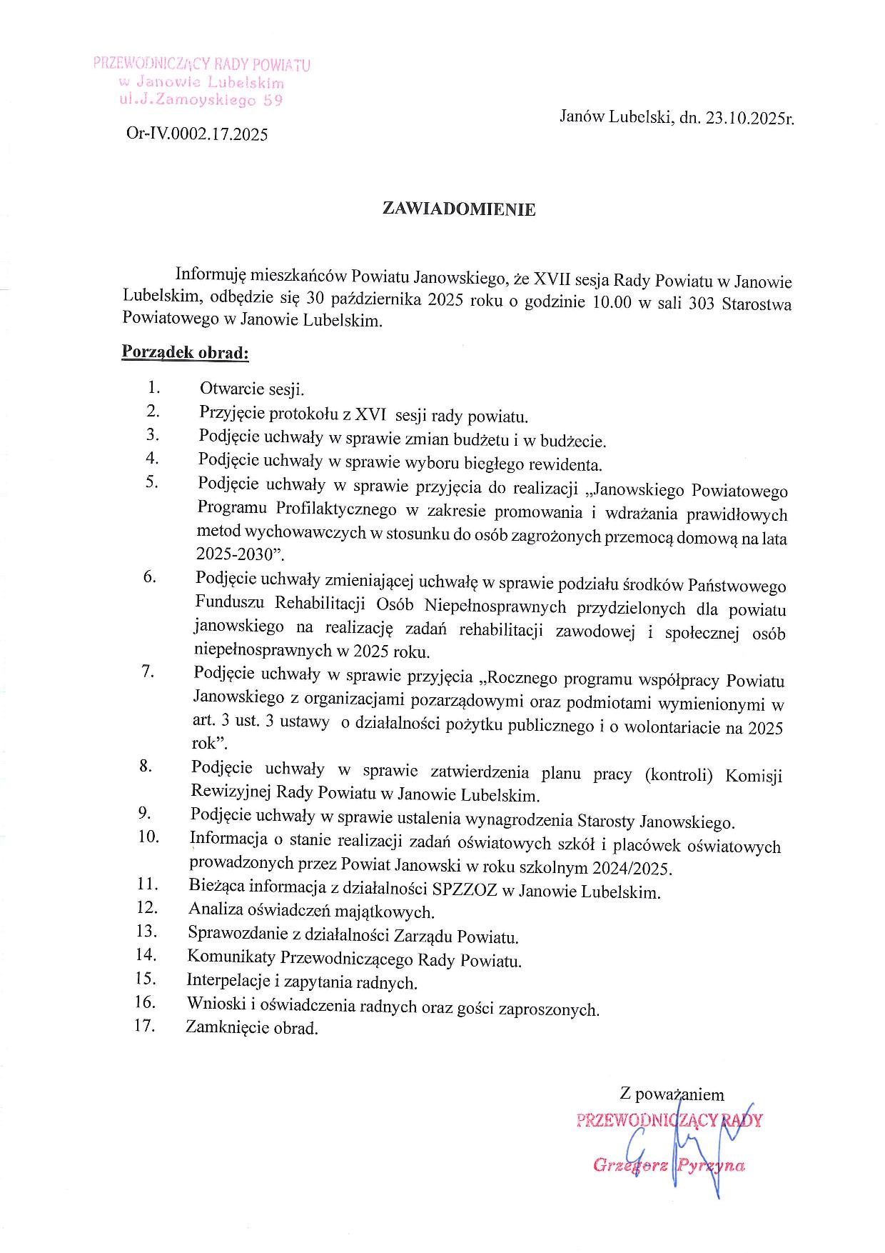 - Zawiadomienie zbliżającej się Sesji Rady Powiatu Janowskiego
