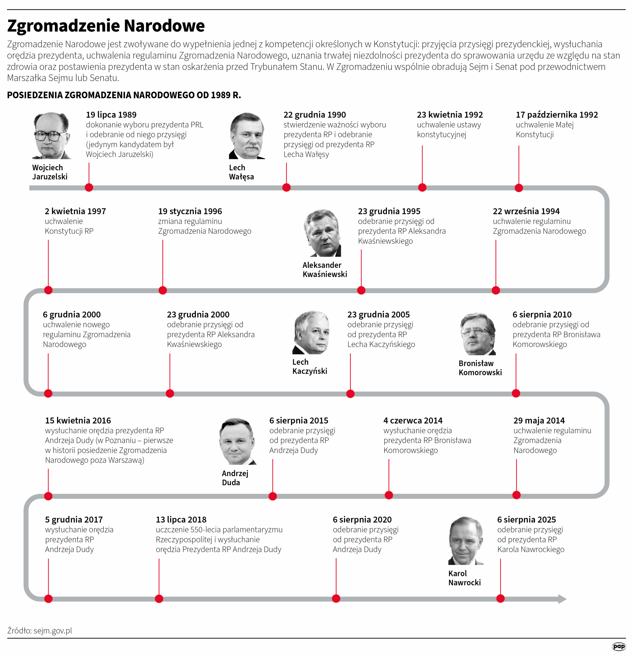 O godz. 10 w sali plenarnej Sejmu zbierze się Zgromadzenie Narodowe (obradujący wspólnie posłowie i senatorowie), przed którym Karol Nawrocki złoży przysięgę. Przed rozpoczęciem zgromadzenia Andrzej Duda oraz Karol Nawrocki zostaną powitani w Sejmie przez marszałka tej izby Szymona Hołownię oraz marszałek Senatu Małgorzatę Kidawę-Błońską.