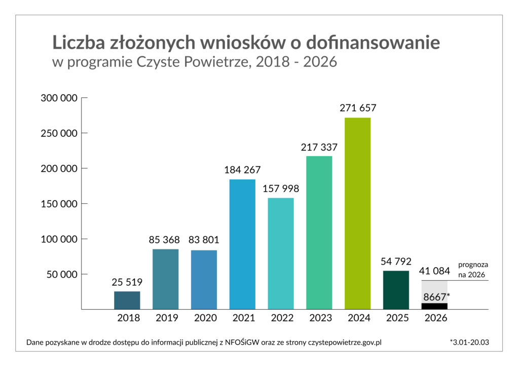 Autorzy apelu wskazują na poważny kryzys programu Czyste Powietrze. Po roku od jego ponownego uruchomienia widać, iż tempo realizacji celów jest bardzo wolne. W 2025 r. do programu złożono zaledwie 55 tys. wniosków – to prawie pięciokrotnie mniej niż w 2024 r. i blisko czterokrotnie mniej niż w 2023 r. W obecnym tempie cel programu (modernizacja 2,5 miliona domów) zostanie osiągnięty za około 40 lat.