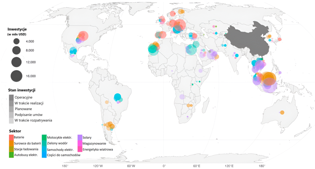 Skala chińskich inwestycji. Źródło: Net Zero Policy Lab.Opublikowany we wrześniu tego roku przez Net Zero Policy Lab raport pokazuje, iż Chiny zadeklarowały, iż od 2022 roku zainwestują co najmniej 227 mld dolarów w przemysł związany z OZE. Co warto podkreślić, od 2022 roku uruchomiano już ponad 80 proc. zadeklarowanych projektów. Poza krajami rozwijającymi się, Chiny, jak pokazuje mapa, inwestują u nas.