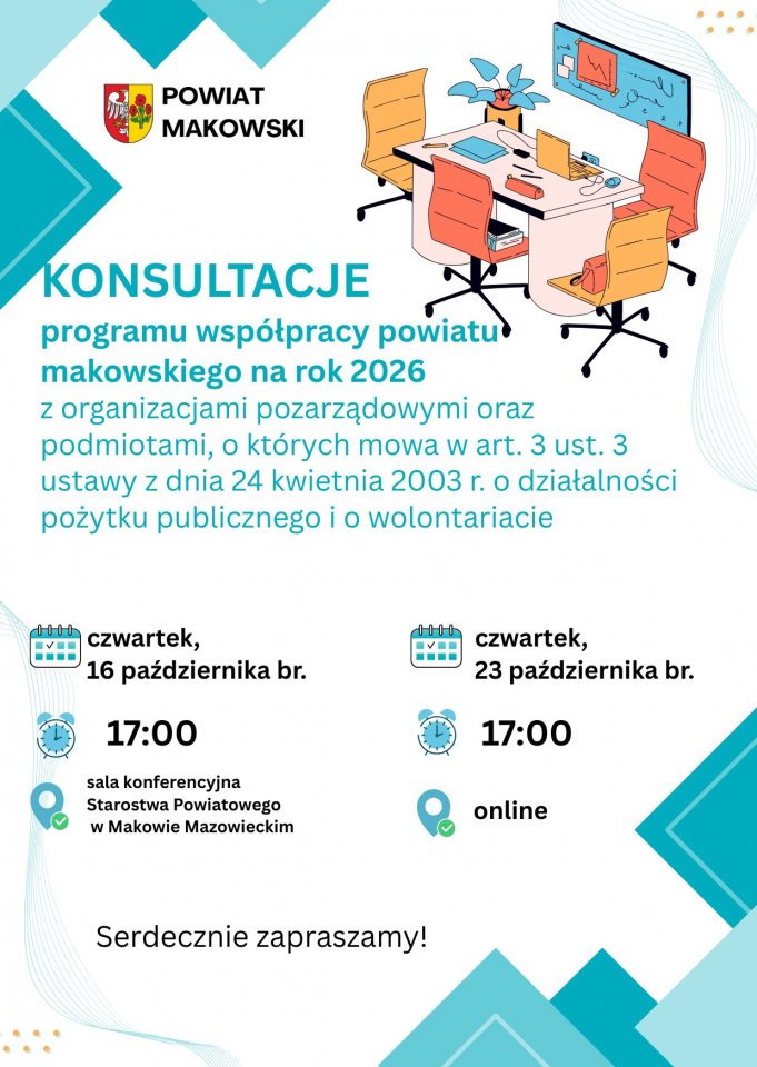 Konsultacje projektu „Programu współpracy powiatu makowskiego na 2026 rok z organizacjami pozarządowymi oraz podmiotami, o których mowa w art. 3 ust. 3 ustawy z dnia 24 kwietnia 2003 r. o działalności pożytku publicznego i o wolontariacie”. Zarząd Powiatu w Makowie Mazowieckim zaprasza organizacje pozarządowe oraz podmioty wymienione w art. 3 ust. 3 ustawy o działalności pożytku publicznego i o wolontariacie do konsultacji projektu „Programu współpracy powiatu makowskiego na 2026 rok z organizacjami pozarządowymi oraz podmiotami, o których mowa w art. 3 ust. 3 ustawy z dnia 24 kwietnia 2003 r. o działalności pożytku publicznego i o wolontariacie”. Konsultacje prowadzone będą od dnia 10 października 2025 r. do dnia 24 października 2025 r. w formie: 1) zamieszczania na stronie internetowej powiatu makowskiego, w Biuletynie Informacji Publicznej Starostwa Powiatowego oraz tablicy ogłoszeń Starostwa Powiatowego w Makowie Mazowieckim, 2) otwartego spotkania z przedstawicielami rady działalności pożytku publicznego i organizacjami pozarządowymi w dniu 16 października 2025 roku o godz.17:00 w Starostwie Powiatowym w Makowie Mazowieckim oraz spotkania online w dniu 23 października 2025 roku o godz. 17:00 . Propozycje zmian można zgłaszać do dnia 24 października 2025 r. w następujących sposobach: 1) przesłać pocztą elektroniczną na adres: magdalena.kaczmarek@powiat– makowski.pl , 2) złożyć osobiście w Starostwie Powiatowym w Makowie Mazowieckim ul. Rynek 1, 06–200 Maków Mazowiecki pok. Nr 7C, 3) przesłać pocztą na adres: Starostwo Powiatowe w Makowie Mazowieckim, ul. Rynek 1, 06-200 Maków Mazowiecki (decyduje data wpływu). Nie będą uwzględniane opinie i propozycje zmian: 1) przekazane w innej formie niż wg załączonego formularza konsultacji, 2) złożone na formularzu ale po ich zakończeniu tj. po 24.10.2025 r., 3) niepodpisane. Link do projektu uchwały: https://www.powiat-makowski.pl/.../konsultacje-projektu...