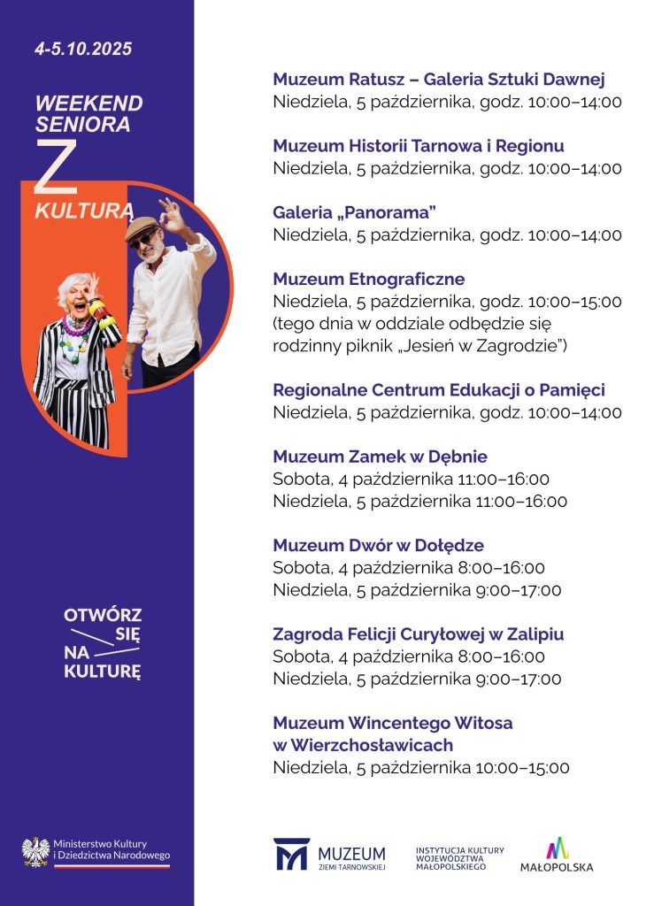 Muzeum Ziemi Tarnowskiej – podobnie jak w poprzednich latach – włącza się w ogólnopolską akcję „Weekend Seniora z Kulturą”, otwierając swoje oddziały dla osób powyżej 60. roku życia. To wyjątkowa okazja, aby seniorzy mogli bezpłatnie zwiedzać wystawy stałe w muzeach w Tarnowie, Dębnie, Dołędze, Wierzchosławicach i Zalipiu.