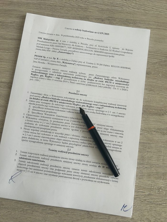 W dniu dzisiejszym SIM Małopolska podpisała umowę na realizację inwestycji przy zbiegu ulic Łyczków i Boratyńskiego w Gminie Ryglice.